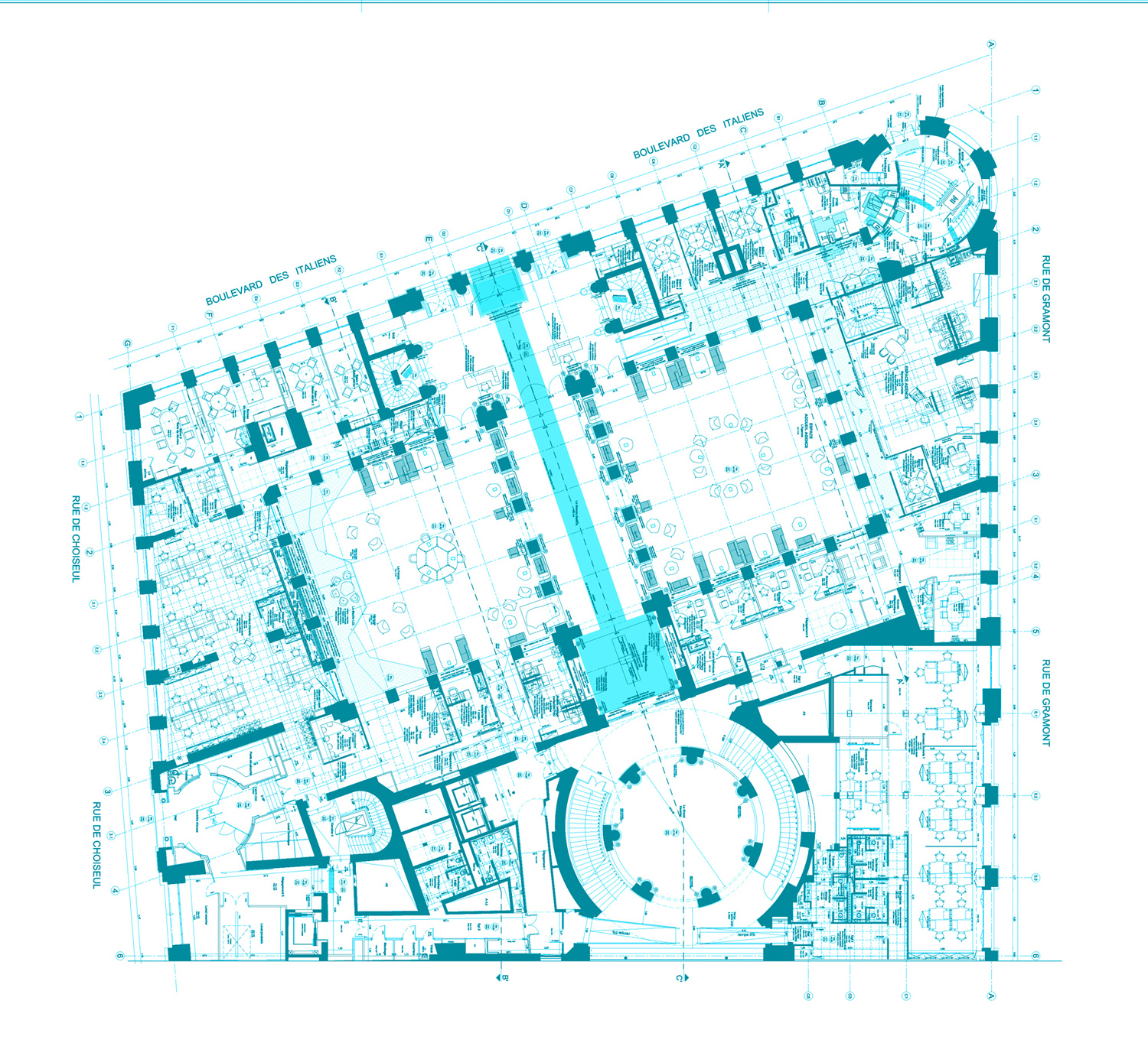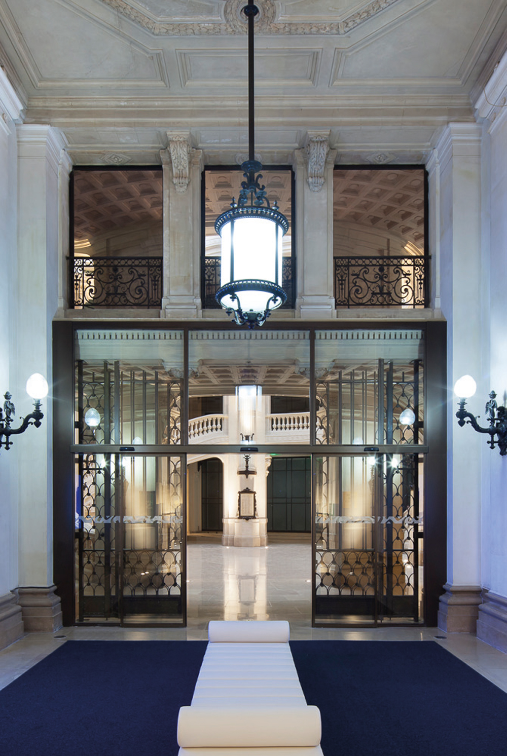 Le projet consiste en l’aménagement des espaces prestigieux et chargés d’histoire de cet édifice datant du XIXe siècle, bâti à la gloire de l’activité bancaire. Les nouveaux aménagements s’inscrivant au rez-de-chaussée, comprennent l’accueil, les deux atriums et la colonnade menant à la rotonde où se dresse le majestueux escalier à double révolution. •