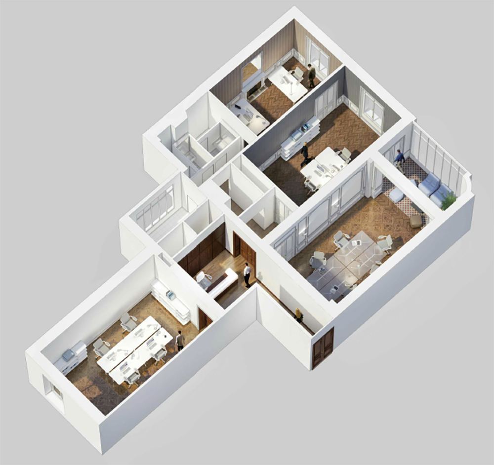 Sur la plus belle avenue du monde : une distribution des espaces pour un confort professionnel spacieux et optimal. Aménagement des zones de bureaux individuels pour préserver la discrétion. Salle de réunion avec petit salon. Mobilier banque d’accueil en panneaux Oberflex chêne teinté Wengé avec son plateau émalite décolaque blanc. Parquet à l’anglaise. Finitions en inox brossé. Raffinement des matières. Ameublement en design contemporain.