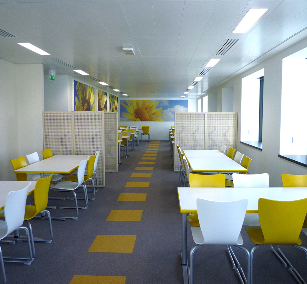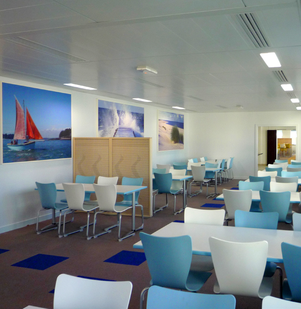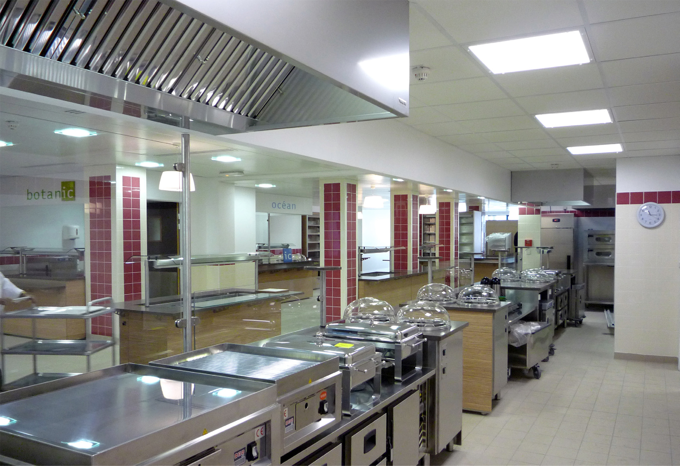 Création en site occupé et dans un délai de 6 mois, d’un restaurant d’entreprise de type Self Service Scramble de 650 couverts par jour. Aménagement au niveau R+1 d’un scramble de 160 m² comprenant deux salles de restaurant (450 m²) bénéficiant de vues directes sur le parvis de la Défense. Réalisation des cuisines et de la laverie (200 m²). •