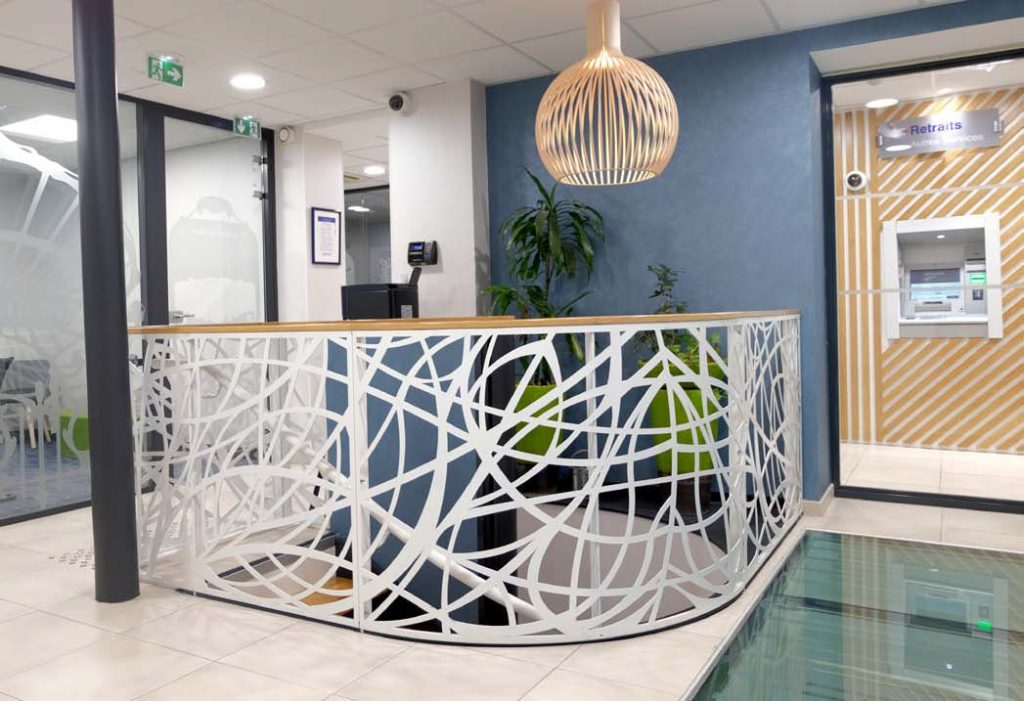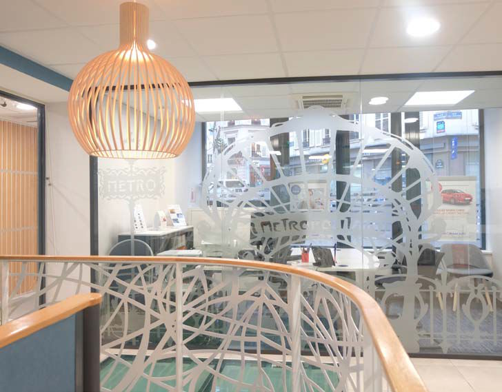Le projet concerne la rénovation d’une agence bancaire Crédit Mutuel. Les travaux consistent à la modification des façades au RDC et de l’aménagement intérieur des 3 niveaux avec la volonté d’apporter le maximum de luminosité. Jeu de lumière filtrée par la vitrophanie en verre sablé qui reprend les motifs du métro Guimard. Utilisation d’une essence unique de bois de hêtre : parement distributeur, banque d’accueil, main courante, luminaire. Design du garde-corps de l’escalier en acier. •