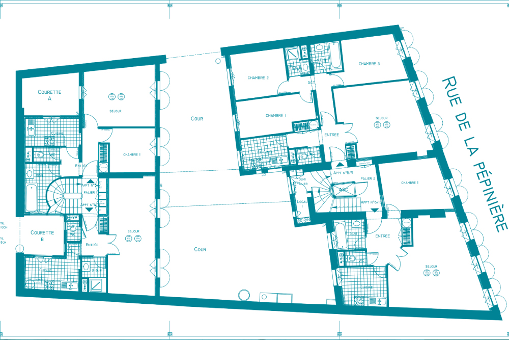 Restructuration complète d’un immeuble composé 6 étages sur un niveau de sous sol (caves) d’une surface totale de 1000 m². Curage complet, reprise des structures et des planchers, création d’une gaine d’ascenseurs dans une cage d’escalier existante, création de lucarnes sur la rue de la Pépinière. Ravalement de l’ensemble des façades (rue et cours). Aménagement de 12 appartements et d’un plateau de bureaux du R+1. •